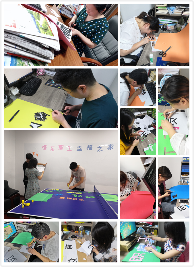 你看我剪的就是這么完美”“對喲,你就是如此優秀”,分公司機關全體員工齊動員,相協作互相配合,你裁我剪,你剪我貼,在跳動的文字中談工作談理想,其樂融融,現場呈一片祥和之氣成果呈現,大家看著布置好的職工之家滿眼都是成就的喜悅,臉上露出了愉快的笑容。