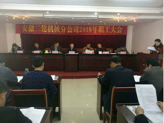 大會聽取并審議通過了《機械分公司工作報告》、《機械分公司財務工作報告》、《分公司2017年度業務招待費使用情況報告》。分公司工作報告全面總結了2017年生產經營管理工作,對2018年經營發展形勢進行研判,明確提出了分公司2018年度工作目標和工作重點。報告指出,2018年是全面貫徹黨的十九大精神的開局之年,是改革開放40周年,是決勝全面建成小康社會、實施“十三五”規劃承上啟下的關鍵一年,也是我們二建公司全面復興的決勝之年。2017年度機械分公司在公司各級領導的關懷和指導下,堅持安全生產,努力完成公司年度經濟指標,凝心聚力,克服工作中的各種困難,確保機械設備安拆的安全和質量,在資金緊張,收款困難的前提下,完成了年初公司制定的各項經濟指標。