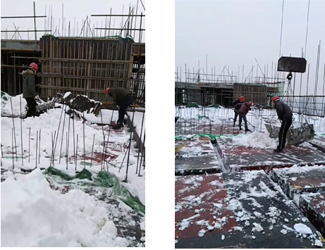 隨著“大干60天生產競賽”的圓滿結束,宿州市于元月4日迎來了第一場大范圍強降雪。持續了兩天的大雪使整個宿州籠罩在一片白色之中,道路全部被阻斷,現場施工也一度停滯。為做好極端天氣下建筑施工的安全生產工作,一方面項目部緊急成立應急小組,對暴雪造成的安全隱患進行全面排查,尤其對生活區、樓層外架、現場臨時用電、起重設備等進行專項檢查,及時清理積雪、消除隱患;另一方面為保證雪后施工的正常開展,項目部動員管理人員對樓頂現澆面的積雪進行清理,為下一步的安全生產提供及時的工作面。